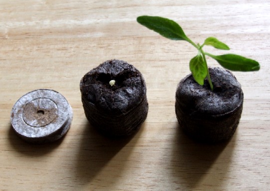 Pro informaci, zde máte jednotlivé fáze práce se sadbovačem. Sadbovač v pohotovostním „suchém, slisovaném“ stavu, sadbovač nabobtnalý vodou a osetý semínkem, sadbovač se sazeničkou papriky. Všimněte si že sadbovač je v každém stavu „stabilní“ a tak jak rostlinka potřebuje i pevný.