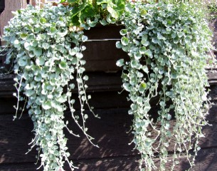 Dichondra stříbrná vytváří hluboké převisy velice dekorativních stříbřitě zelených lístků. Roste až do mrazů.