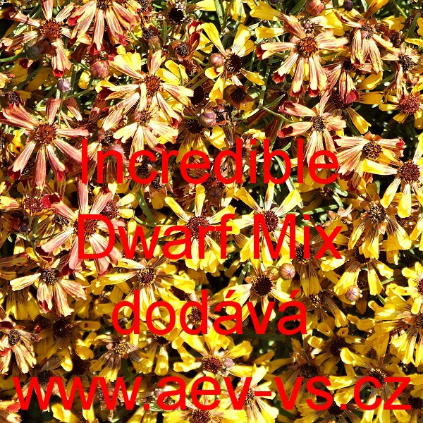 Popis: Krásnoočko zkřížené (Coreopsis x hybrida) Incredible Dwarf Mix je asi 50 centimetrů vysoká velice zajímavá směs jednobarevných i vícebarevných jednoletých kultivarů.