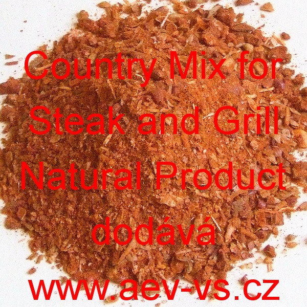 Country Mix for Steak and Grill Natural Product (farmářský steak) je speciální směs přírodních koření bez přidaných alergenů, glutamátu sodného, umělých barviv, zvýrazňovačů chuti, konzervačních látek (tak zvaných Éček) či aditiv. Tato směs je vhodná i pro děti, těhotné a kojící ženy a alergiky. Použít ji můžeme při přípravě různých druhů mas.