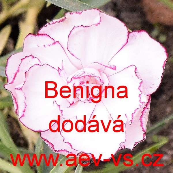 Popis: Hvozdík karafiát (Dianthus caryophyllus) Benigna je asi 60 centimetrů vysoká smetanově bílá až plnokvětá voňavá jednoletá květina s fialovým lemem okvětních plátků. Hodí se i do vázy, k řezu.