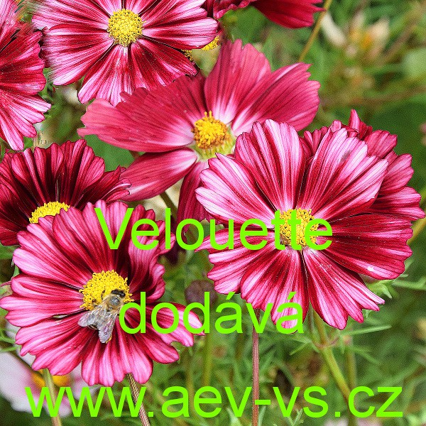 Popis: Krásenka zpeřená (Cosmos bipinnatus) Velouette je asi 60 až 70 centimetrů vysoká košatá bohatě kvetoucí tmavě červená jednoletá květina s bílými pruhy v okvětních plátcích. Některé květy mohou být i bílé s tmavě červeným zbarvením okolo středu květu a na okrajích okvětních plátků. Hodí se na záhon, do velkého květináče, truhlíku a okrasného koryta. Semena se dodávají ve výběrové kvalitě Professional Seeds.