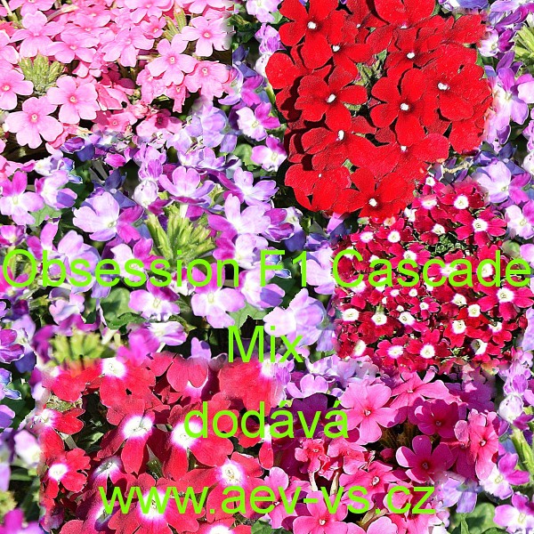 Sporýš zahradní, zkřížený (Verbena hybrida) Obsession F1 Cascade Mix je směs velice dekorativních barevných nízkých, převislých bohatě kvetoucích jednoletých květin.
