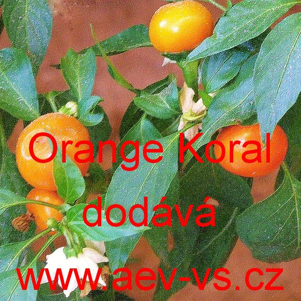 Paprika roční zeleninová (Capsicum annuum L.) Orange Koral je raná/poloraná oranžová silněji ostrá SHU cca 25 000 aromatická kulatá (třešňová) asi 2 až 3 centimetrová zeleninová paprika roční na nakládání i sušení.