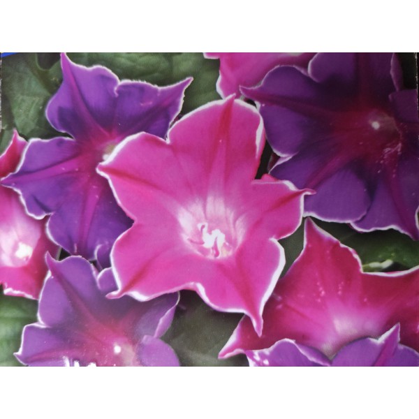 Povíjnice nachová (Ipomoea purpurea) Picotee Mix je velice dekorativní směs vysokých pnoucích růžových a modrofialových (v odstínech) jednoletých květin s hvězdou v květu a bílým okrajem okvětních plátků.