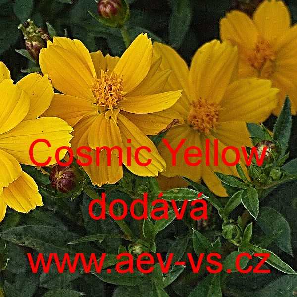 Krásenka žlutá, sírožlutá (Cosmos sulphureus) Cosmic Yellow je nízká žlutá poloplná jednoletá květina.