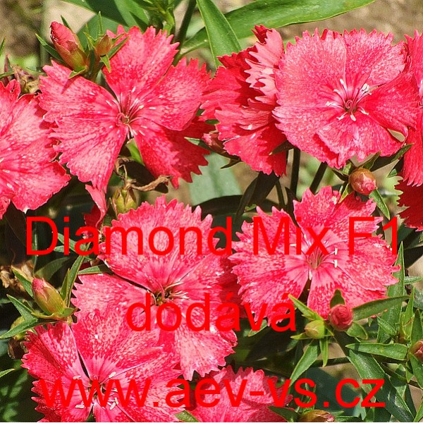 Popis: Hvozdík čínský (Dianthus chinensis) Diamond Mix je asi 30 až 50 centimetrů vysoká velkokvětá jednoduše až ploloplně kvetoucí směs jednoletých velkokvětých květin. Hodí se na záhon, do truhlíku, květináče a okrasného koryta.