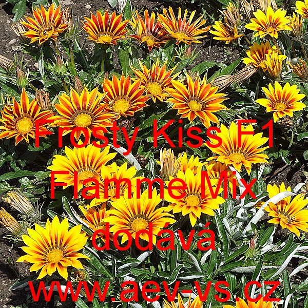 Úborovka zářivá, gazánie pevná (Gazania rigens) Frosty Kiss F1 Flamme Mix je nízká pevná směs jednoletých květin se stříbřitě zelenými listy. Vykvétá velkými dvoubarevnými květy.