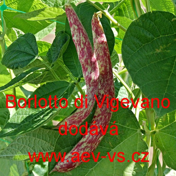 Popis: Fazol tyčkový (Phaseolus vulgaris var. vulgaris) Borlotto di Vigevano je pozdní žluto červeno fialově melírovaný tyčkový fazol. Vytváří červeno hnědo fialová široce ledvinkovitá hnědě žíhaná semena.