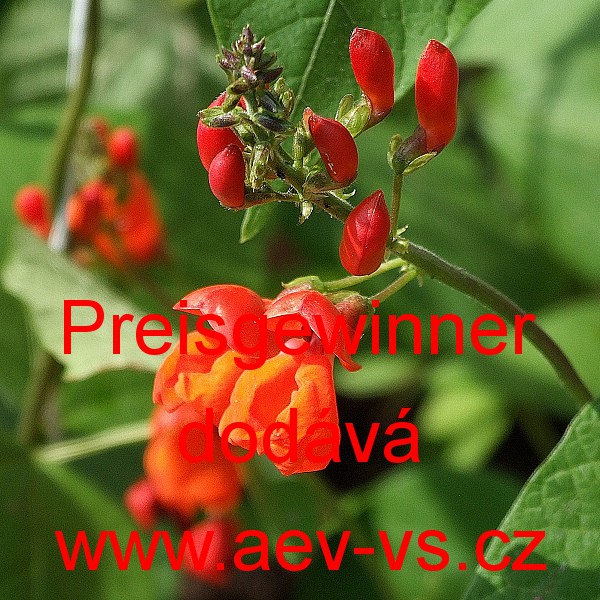 Popis: Fazol pnoucí šarlatový (Phaseolus coccineus) Preisgewinner je poloraný zelenoluský (až "obří") pnoucí šarlatový fazol. Pne se až do výšky 500 centimetrů. Vykvétá červenými květy. Vytváří asi 40 centimetrů dlouhé šťavnaté ploché lusky a velká sytě fialově melírovaná semena.