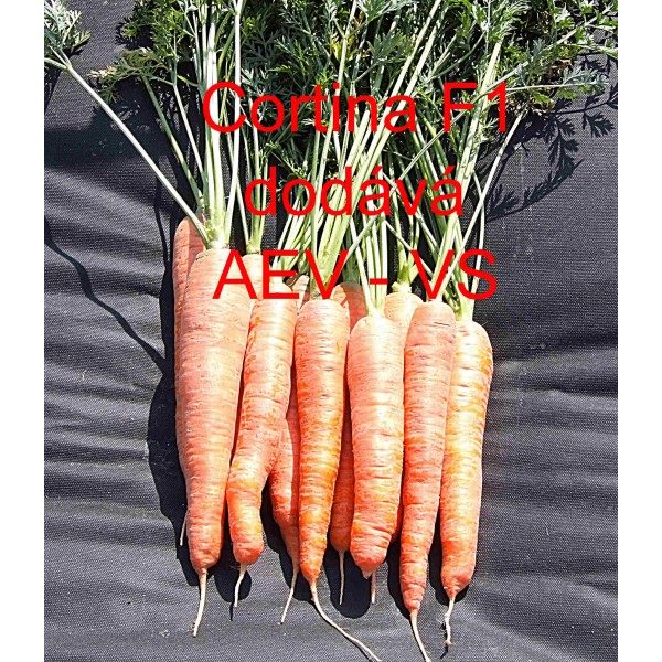 Popis: Mrkev obecná (Daucus carota ssp. Sativus) Cortina F1 je pozdní asi 18 až 20 centimetrů dlouhá válcovitá mrkev obecná na skladování. Hlava kořene nezelená.
