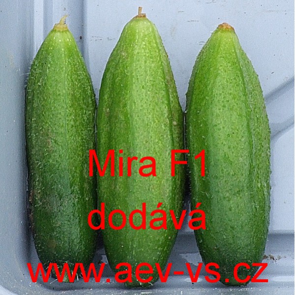 Popis: Okurka setá nakládačka (Cucumis sativus) Mira F1 je poloraná „hladká“ hybridní okurka setá nakládačka. Odolává chorobám. Poměr délky a šířky plodu je asi 3,1:1.
