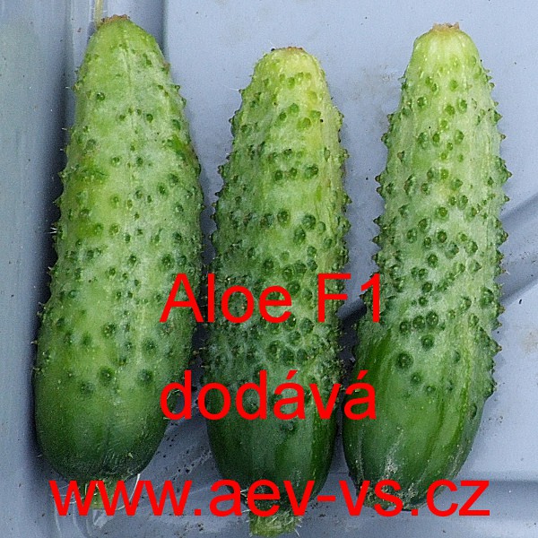 Popis: Okurka setá nakládačka (Cucumis sativus) Aloe F1 je raná až poloraná "hrubá" tmavě zelená chorobám odolná geneticky nehořká hybridní okurka setá nakládačka. Poměr délky a šířky plodu je asi 3,6:1.