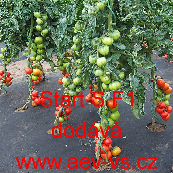 Rajče tyčkové (Solanum lycopersicum L.) Start S F1 je rané velice chutné středně vysoké tyčkové intenzívně červené kulaté asi 75-90 gramové hybridní rajče do skleníku, fóliovníku a na záhon.