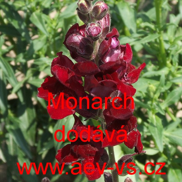 Popis: Hledík větší (Antirrhinum majus maximum) Monarch je asi 90 centimetrů vysoká tmavě červená jednoletá květina.