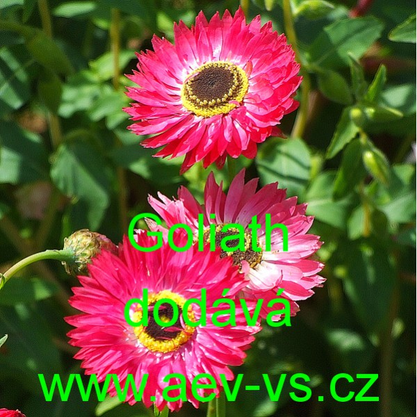 Popis: Smilek růžový nesmrtelka (Helipterum roseum) Goliath je asi 50 centimetrů vysoká růžově červená jednoletá květina s tmavým středem. Dá se využít i na sušení, do suchých vazeb.