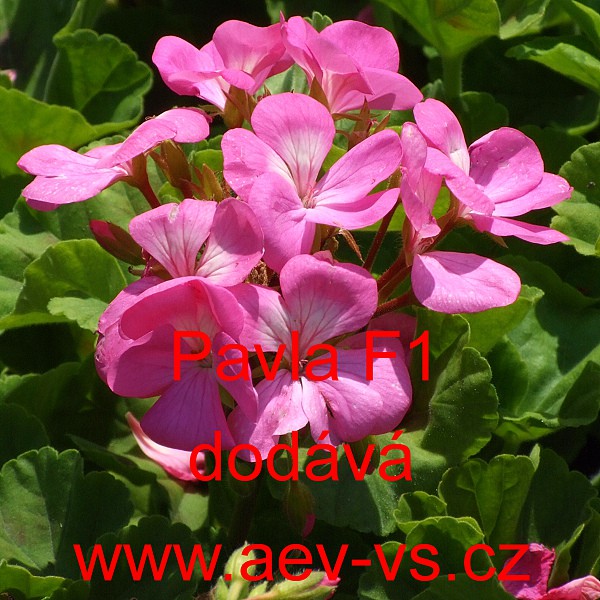Muškát páskatý (Pelargonium zonale) Pavla F1 je nízká fialově růžová jednoletá květina s bílým okem v květu. Obrůstá zelenými listy.