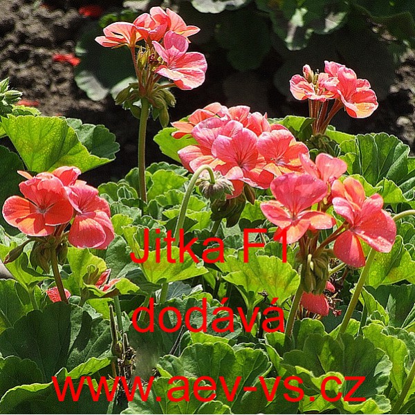 Popis: Muškát páskatý (Pelargonium zonale) Jitka F1 je asi 35 centimetrů vysoká lososově růžová jednoletá květina se zelenými listy. Hodí se na záhon, do truhlíku, květináče a okrasného koryta. Semena se dodávají ve výběrové kvalitě Professional Seeds.
