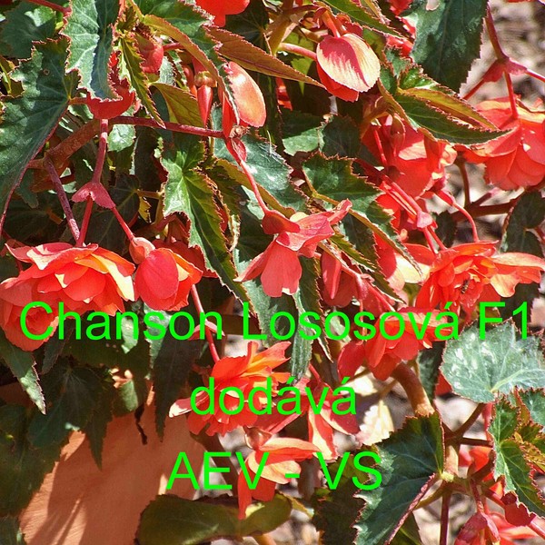Kysala velkokvětá, hlíznatá, převislá (Begonia tuberhybrida pendula) Chanson Lososová F1 je nízká jednoletá květina. Vytváří až 50 centimetrů dlouhé kvetoucí převisy.