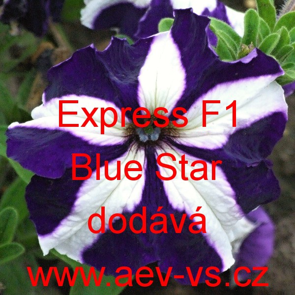Petúnie velkokvětá, zkřížená, nízká (Petunia hybrida grandiflora nana) Express F1 Blue Star je nízká velkokvětá dvoubarevná modrá/bílá jednoletá květina s hvězdou v květu.