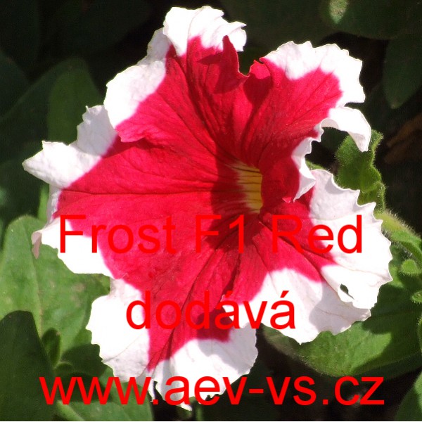 Popis: Petúnie velkokvětá, zkřížená, nízká (Petunia hybrida grandiflora nana) Frost F1 Red je asi 35 centimetrů vysoká červená velkokvětá jednoletá květina s bílým okrajem květů. Hodí se na záhon, do truhlíku, květináče a okrasného koryta. Semena se dodávají ve výběrové kvalitě Professional Seeds.