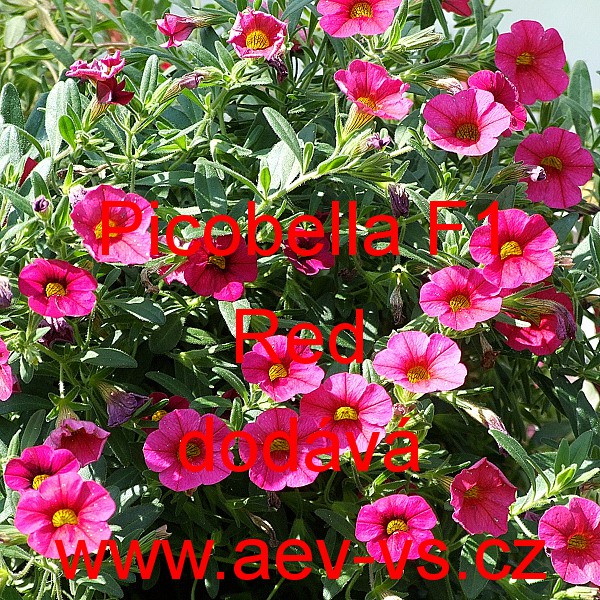 Petúnie drobnokvětá (Petunia milliflora) Picobella F1 Red je nízká červená drobnokvětá jednoletá květina. Hodí se do truhlíku, květináče, závěsných nádob a okrasného koryta. Od začátku léta do zámrazu bohatě a neúnavně vykvétá drobnějšími pevnými květy.
